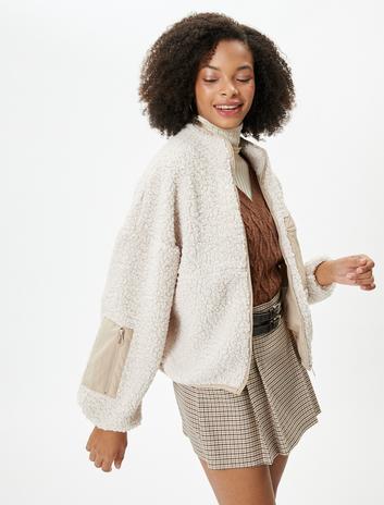 Peluş Sweatshirt Fermuarlı Dik Yaka Cep Detaylı İki Farklı Kumaş Kullanımlı