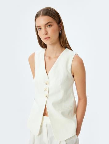 Uzun Keten Yelek Düğmeli V Yaka Astarlı