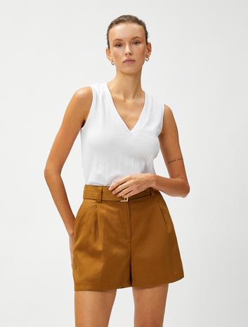 Keten Karışımlı Kruvaze Bağlama Detaylı Şort Etek