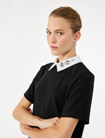 Renk Kontrastlı Kısa Kollu Gömlek Yaka Taş Detaylı Tişört