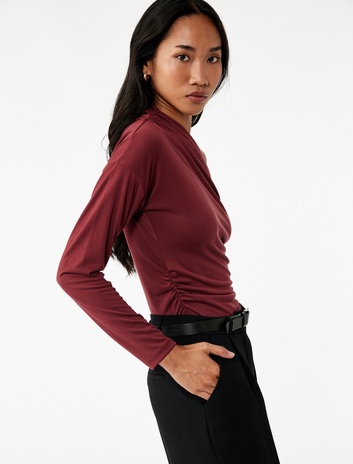 Modal Kumaş Slim Fit Drape Detaylı Asimetrik Yaka Uzun Kollu Tişört