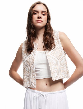 Pamuklu Etnik Desenli Nakış Detaylı Brodeli Bisiklet Yaka Crop Yelek